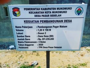 MUKOMUKO (Trendfokus)-Pemerinta Desa (Pemdes) Desa Pasar Sebelah Kecamatan Kota Mukomuko Kabupaten mukomuko melaksanakan tahap 1 pembangunan Pagar Makam dengan menggunakan dana desa (DD) sudah terealisasi sekitar 90%.
