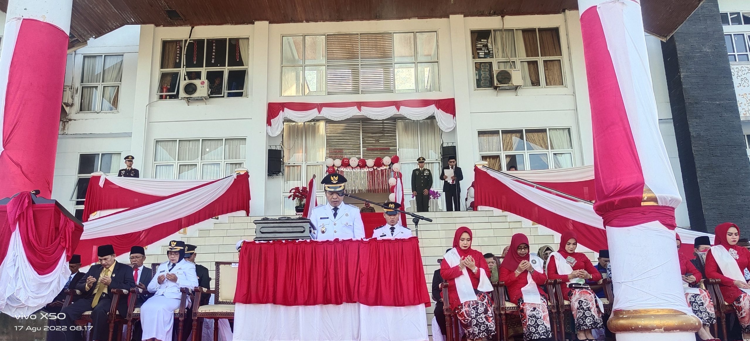 Trendfokus.com-Mengenakan seragam kepala daerah, Bupati Mukomuko H.Sapuan bertindak sebagai inspektur upacara detik-detik Proklamasi Kemerdekaan RI ke-77, di lapangan hijau Pemerintah Kabupaten Mukomuko, Rabu (17/8/2022).