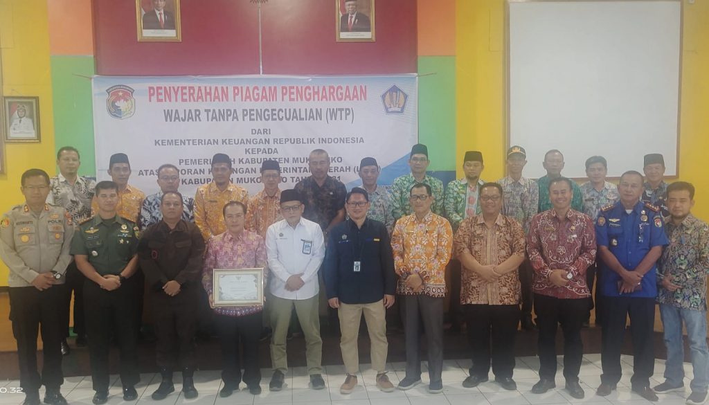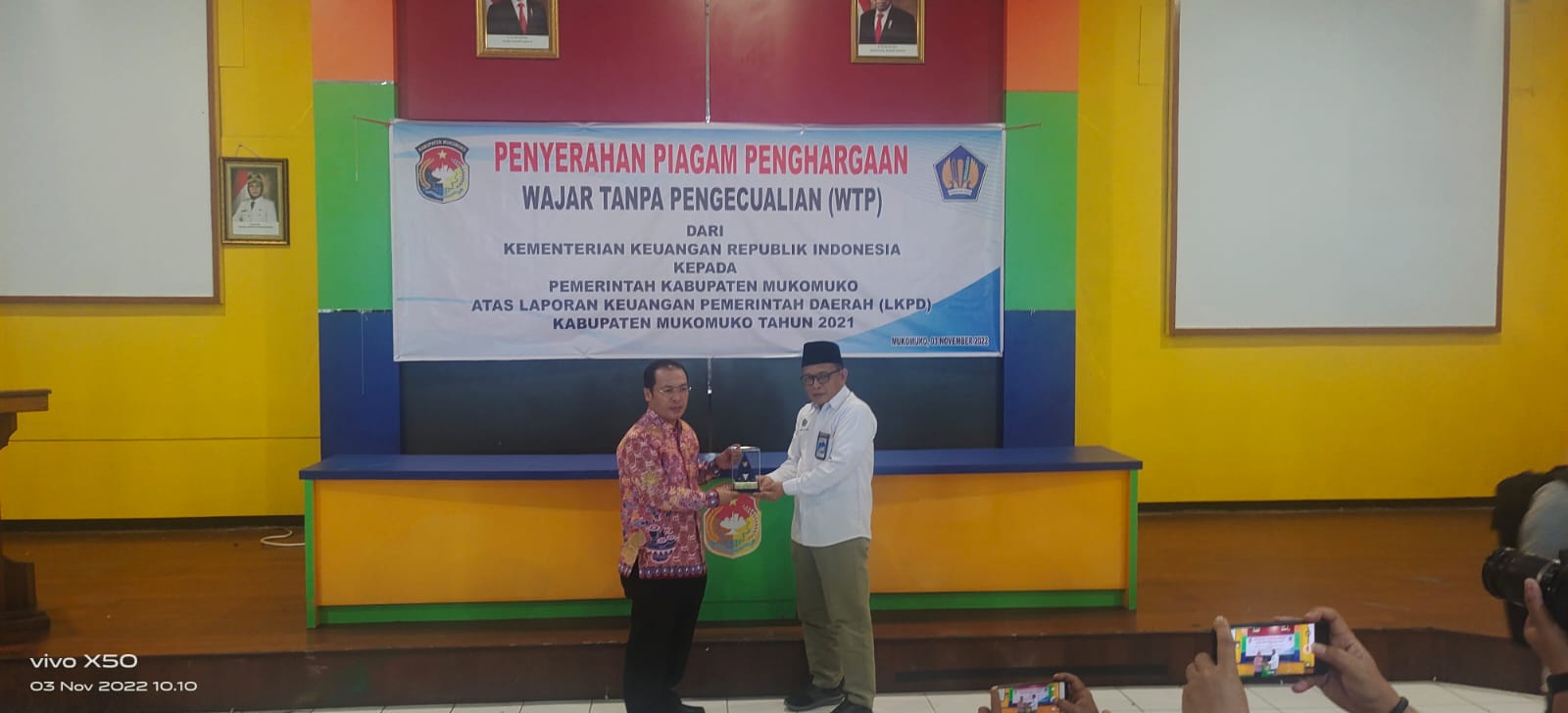 Trendfokus.com-Pemerintah Kabupaten Kabupaten Mukomuko, kembali memperoleh penilaian opini wajar tanpa pengecualian (WTP) dari Kementerian Keuangan Republik Indonesia kepada Pemkab Mukomuko atas Laporan Keuangan Pemerintah Daerah (LKPD) Kabupaten Mukomuko tahun 2021. Penghargaan tersebut merupakan lima kali yang di capai secara berturut-turut. Penerimaan laporan hasil pemeriksaan tahun anggaran (TA) 2021 ini diserahkan langsung Perwakilan Bengkulu Kepala Kantor Wilayah (Kakanwil) Ditjen Perbendaharaan Provinsi Bengkulu Syarwan, SE., MM kepada Bupati Mukomuko H.Sapuan, SE., MM., Ak., CA., CPA dan didampingi OPD terkait di aula Badan Perencanaan, Pembangunan, Penelitian dan Pengembangan Daerah (Bapelitbangda) Kabupaten Mukomuko, Kamis, 03 November 2022.