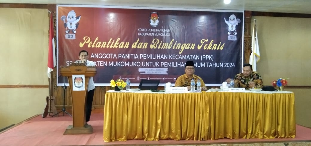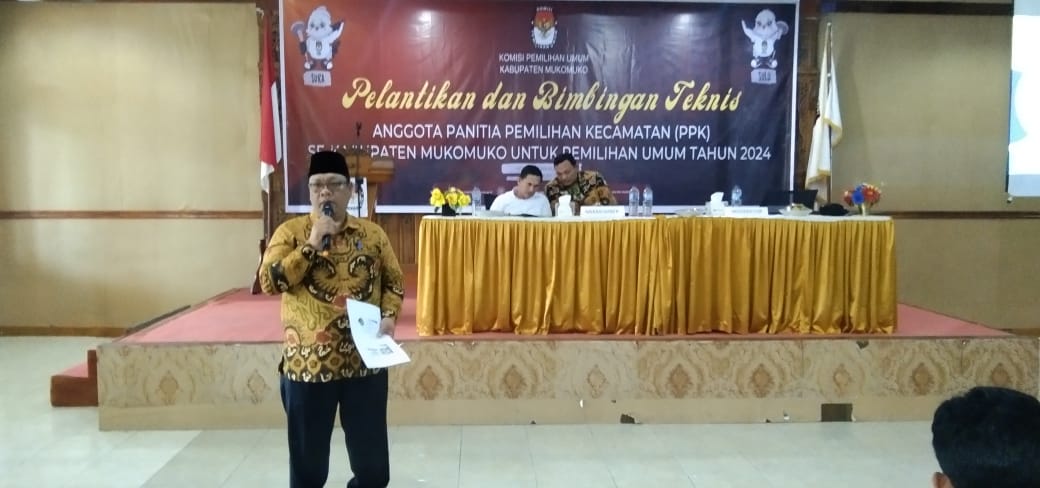Trendfokus.com-Pagi Kamis (5/1/22). Ketua Dewan Perwakilan Rakyat Daerah Kabupaten Mukomuko M.Ali Saftaini, SE saat memberi materi Bimbingan Teknis (BIMTEK) kepada puluhan para Panitia Pemilihan Kecamatan (PPK) se-Kabupten Mukomuko di Aula Hotel Madiara.