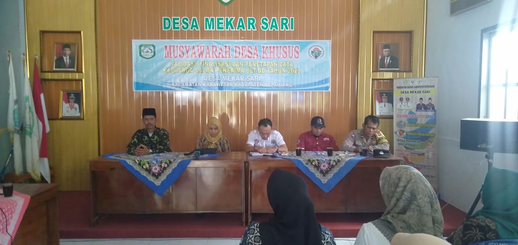 Musyawarah Desa Khusus (Musdesus) Validasi dan Finalisasi Data Calon Penerima BLT Dana Desa tahun 2023 Desa Mekar Sari, prioritas BLT diberikan kepada masyarakat supaya tepat sasaran dan dapat dirasakan manfaatnya oleh masyarakat yang memang membutuhkan.