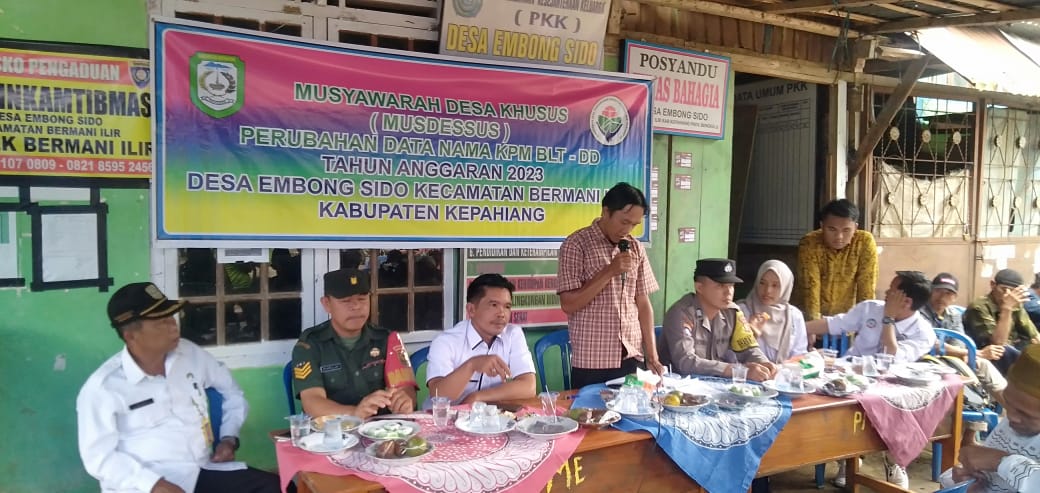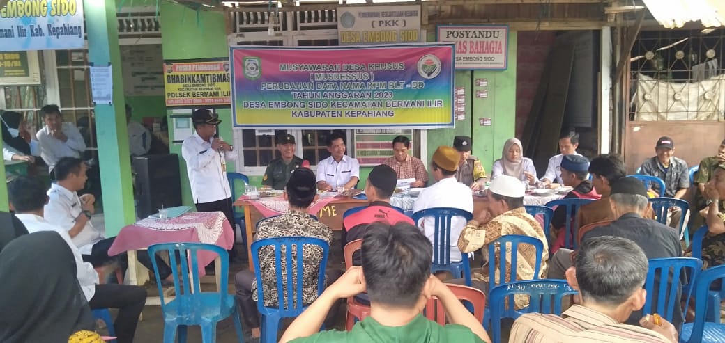 Trendfokus.com-Pemerintah Desa Embong Sido, Kecamatan Bermani Ilir, Kabupaten Kepahian melakukan Musyawarah Desa Khsus (Musdesus) mendata ulang Keluarga Penerima Manfaat Bantua Langsung Tunai (KPM-BLT) Dana Desa Tahun 2023, di Balai Desa Embung Sido, Kecamatan Bermani Ilir. Rabu 22/02/2023.