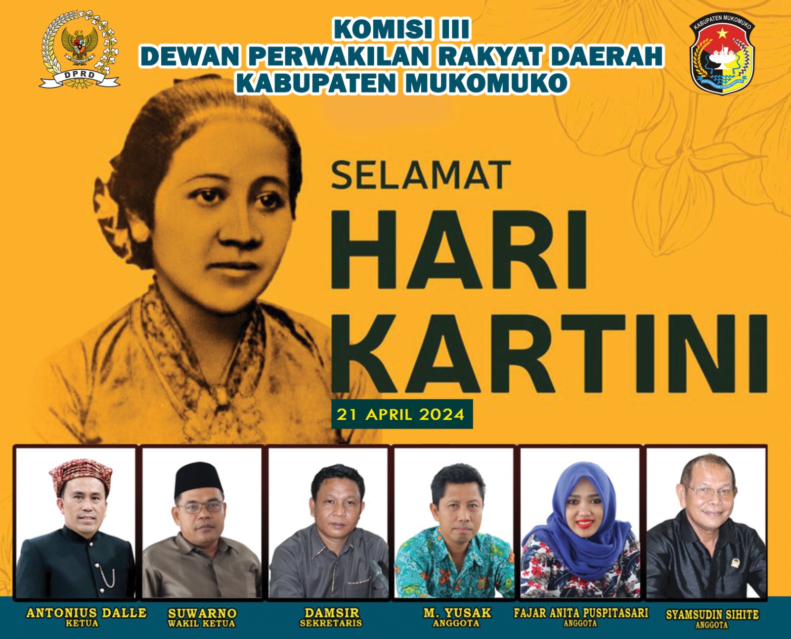 Home / ADVETORIAL / Komisi III Dewan Perwakilan Rakyat Daerah Kabupaten Mukomuko Mengucapkan “Selamat Hari Kartini”ADVETORIALKomisi III Dewan Perwakilan Rakyat Daerah Kabupaten Mukomuko Mengucapkan “Selamat Hari Kartini”April 2, 2024 Share this ArticlePrevious ArticleKetua DPRD Mukomuko Minta Satpol PP Tegas Terhadap Pekat Dibulan SuciNext ArticleKomisi III Dewan Perwakilan Rakyat Daerah (DPRD) Kabupaten Mukomuko Mengucapkan “Selamat Hari Puisi Nasional”Redaksi Related Posts DPRD Mukomuko tetapkan Perda Lindungi Penyandang Disabilitas Maret 14, 2026 Waka I DPRD Mukomuko Wisnu Hadi, SE Ucapkan Selamat atas Pelantik ... Maret 14, 2026 DPRD Mukomuko dorong peran guru untuk tingkatkan kualitas pendidi ... Maret 14, 2026 Tinggalkan BalasanAlamat email Anda tidak akan dipublikasikan. Ruas yang wajib ditandai *KomentarNama Email Situs Web Δ