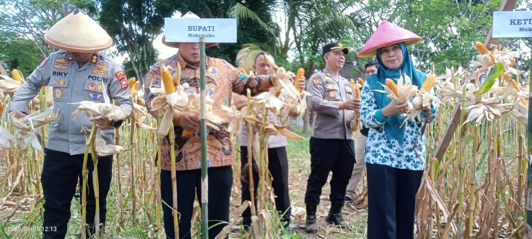 Bupati Mukomuko dan Polres Mukomuko bersama jajaran Polsek melaksanakan penanaman Panen Raya jagung serentak Kuartal II mendukung swasembadan Pangan tahun 2025.