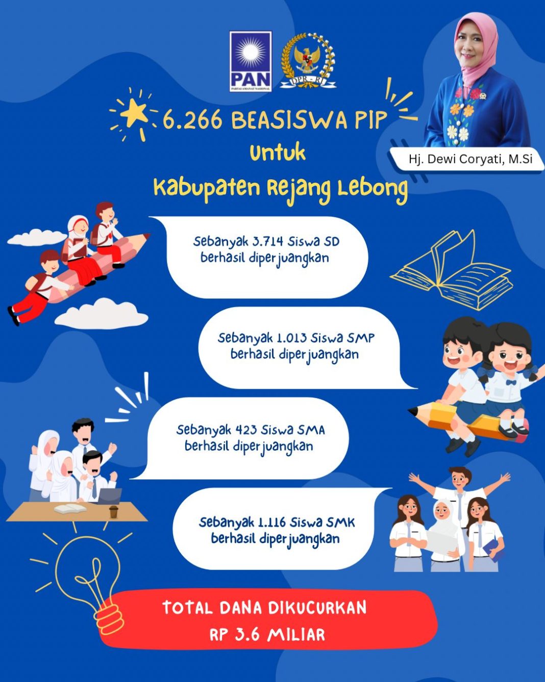 Komitmen Partai Amanat Nasional (PAN) dalam mewujudkan tagline “Bantu Rakyat” kembali dibuktikan melalui kerja nyata salah satu kader terbaiknya, Dr. Hj. Dewi Coryati, M.Si., yang juga merupakan Anggota DPR RI Komisi X. Tahun ini berkat kerjasama kolaborasi dengan Bupati Rejang, H. M. Fikri Tobari yang juga ketua DPD PAN Rejang Lebong , Dewi Coryati berhasil memperjuangkan sebanyak 6.266 beasiswa Program Indonesia Pintar (PIP) untuk siswa tingkat SD, SMP, dan SMA/ SMK di Kabupaten Rejang Lebong.