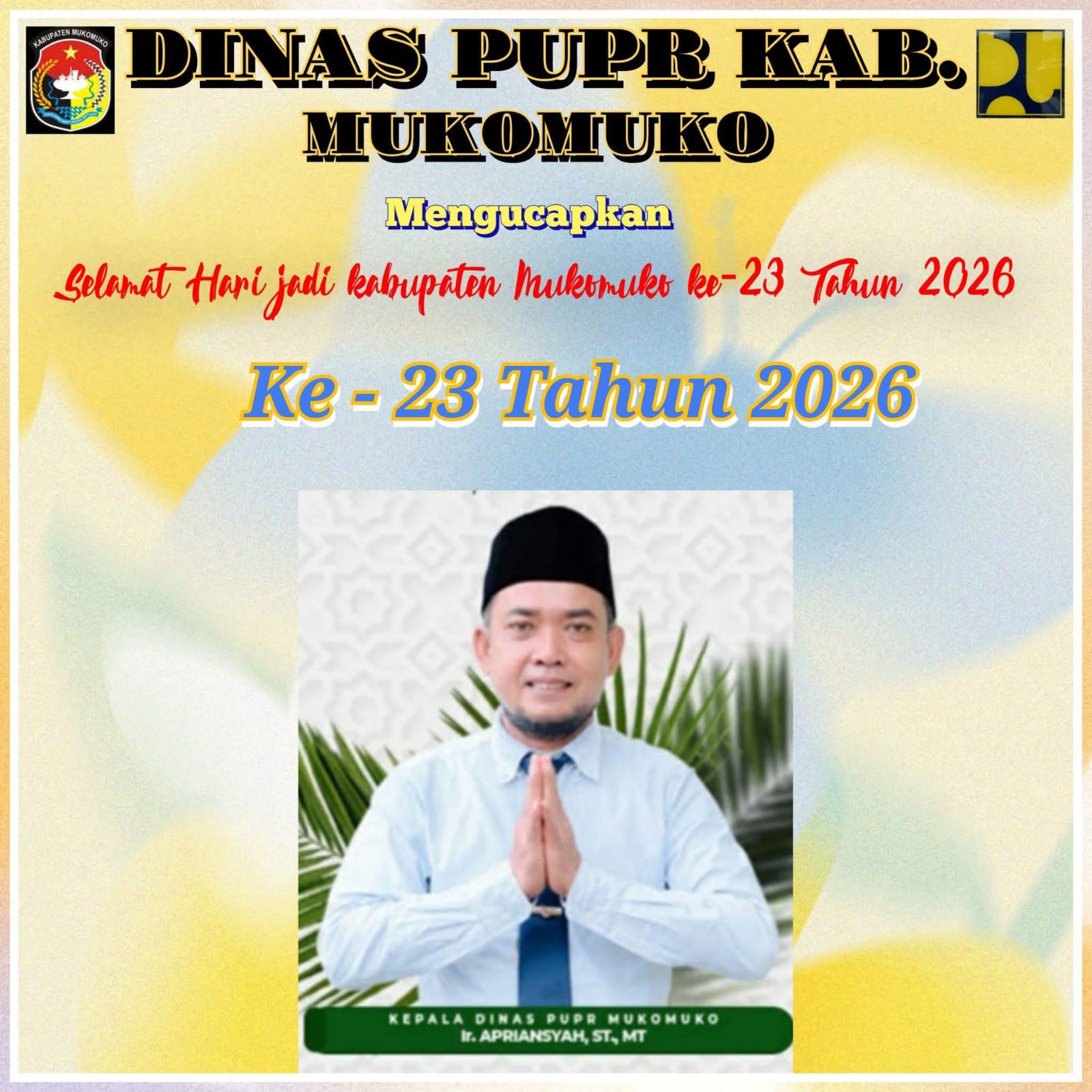 TRENDFOKUS.COM-Kepala Dinas Pekerjaan Umum dan Tata Ruang (PUPR) Kabupaten Mukomuko Apriansyah, ST dengan penuh rasa syukur dan bangga mengucapkan Selamat Hari Ulang Tahun (HUT) ke-23 Kabupaten Mukomuko yang diperingati pada 25 Februari tahun 2026.