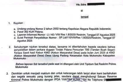 Mukomuko, 11 Agustus 2025 – Polres Mukomuko resmi mengeluarkan Surat Pemberitahuan Perkembangan Hasil Penyelidikan (SP2HP) atas laporan masyarakat terkait dugaan pencurian TBS (Tandan Buah Segar) Kela...